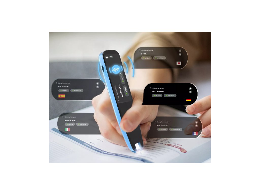 Ruční skener-translátor Anobic ST2. Špičkový a superrychlý překladač řeči, mluveného slova a scénického pera Wi-Fi s překladem do 112 jazyků. Mezi další funkce patří zachycení a překlad textu na displeji překladače, hlasový záznamník a přehrávač MP3. Má vestavěnou baterii s kapacitou 1050 mAh a 3,0palcový barevný dotykový displej s rozlišením 800 × 268 pixelů. Zařízení má vestavěnou paměť 8 GB pro ukládání textových souborů, mp3 a oblíbených překladů. Připojení k internetu přes wifi, podpora bezdrátového připojení BT. .jpg)